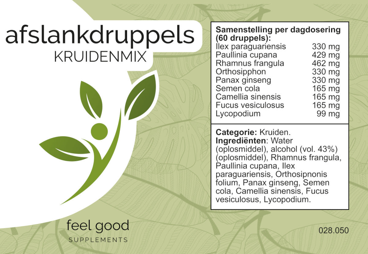 Water (oplosmiddel), alcohol (vol. 43%), Rhamnus frangula, Paullinia cupana, Ilex paraguariensis, Orthosipnonis folium, Panax ginseng, Semen cola, Camellia sinensis, Fucus vesiculosus, Lycopodium.