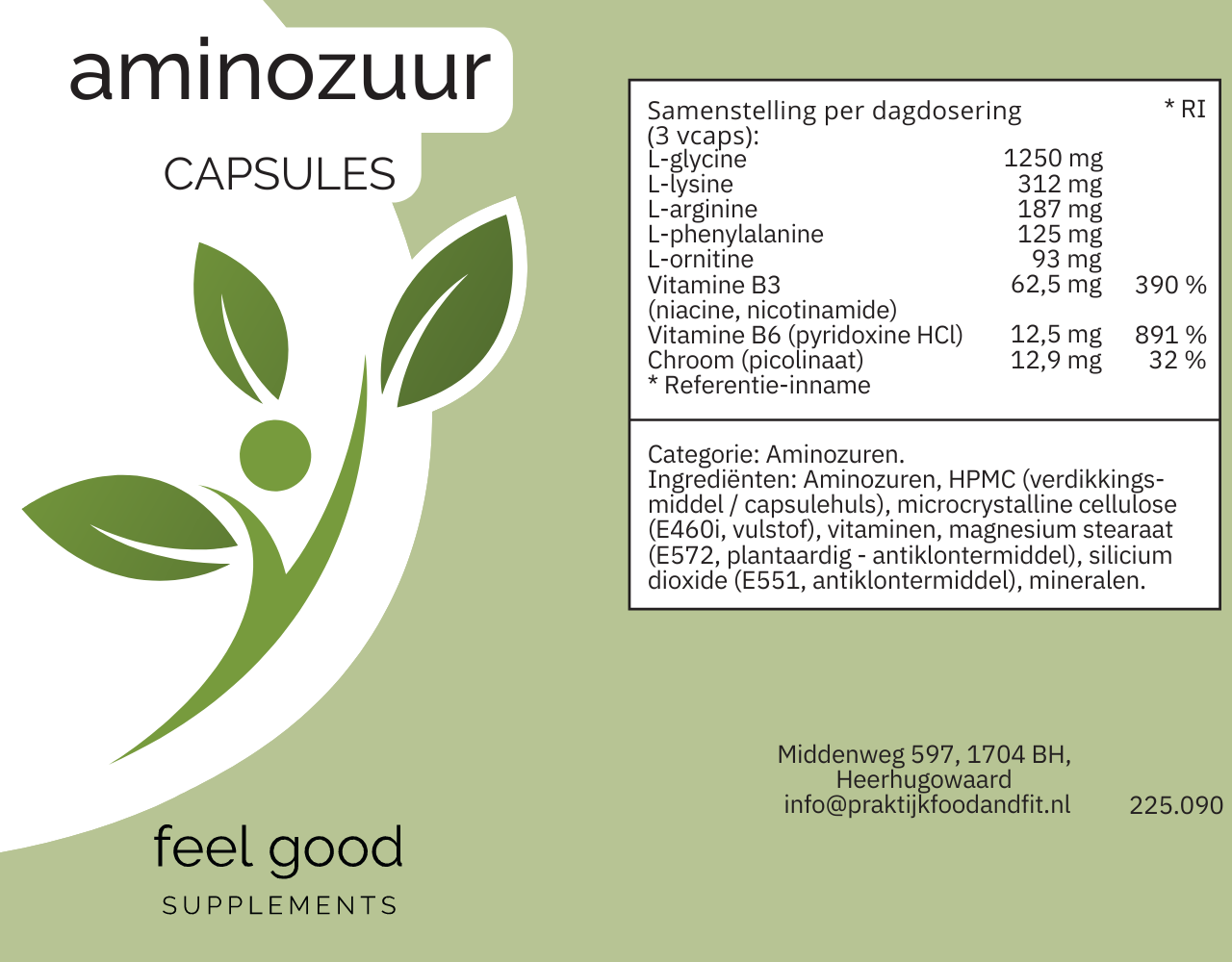 Aminozuren, HPMC (verdikkingsmiddel/capsulehuls), microcrystalline cellulose (E460i, vulstof), vitaminen, magnesium stearaat (E572, plantaardig - antiklontermiddel), silicium dioxide (E551, antiklontermiddel), mineralen.