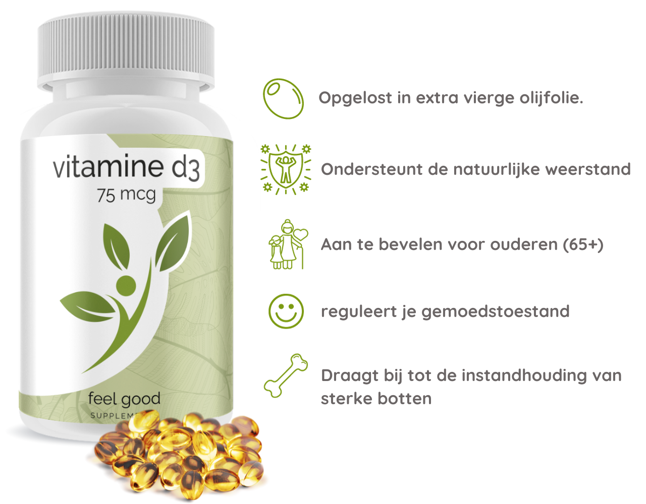Ontdek de kracht van Vitamine D3 voor een gezond en vitaal leven! Onze Vitamine D3-softgels bieden jou talloze voordelen die je lichaam optimaal laten functioneren. Met een krachtige dosering van 75 mcg per softgel en de best opneembare vorm van vitamine D3 cholecalciferol, vul je effectief tekorten aan en geef je jezelf een boost.