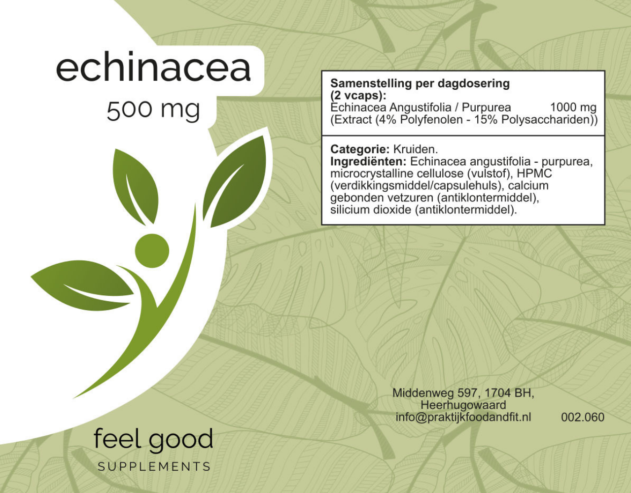 Echinacea angustifolia - purpurea, microcrystalline cellulose (vulstof), HPMC (verdikkingsmiddel/capsulehuls), calcium gebonden vetzuren (antiklontermiddel), silicium dioxide (antiklontermiddel).