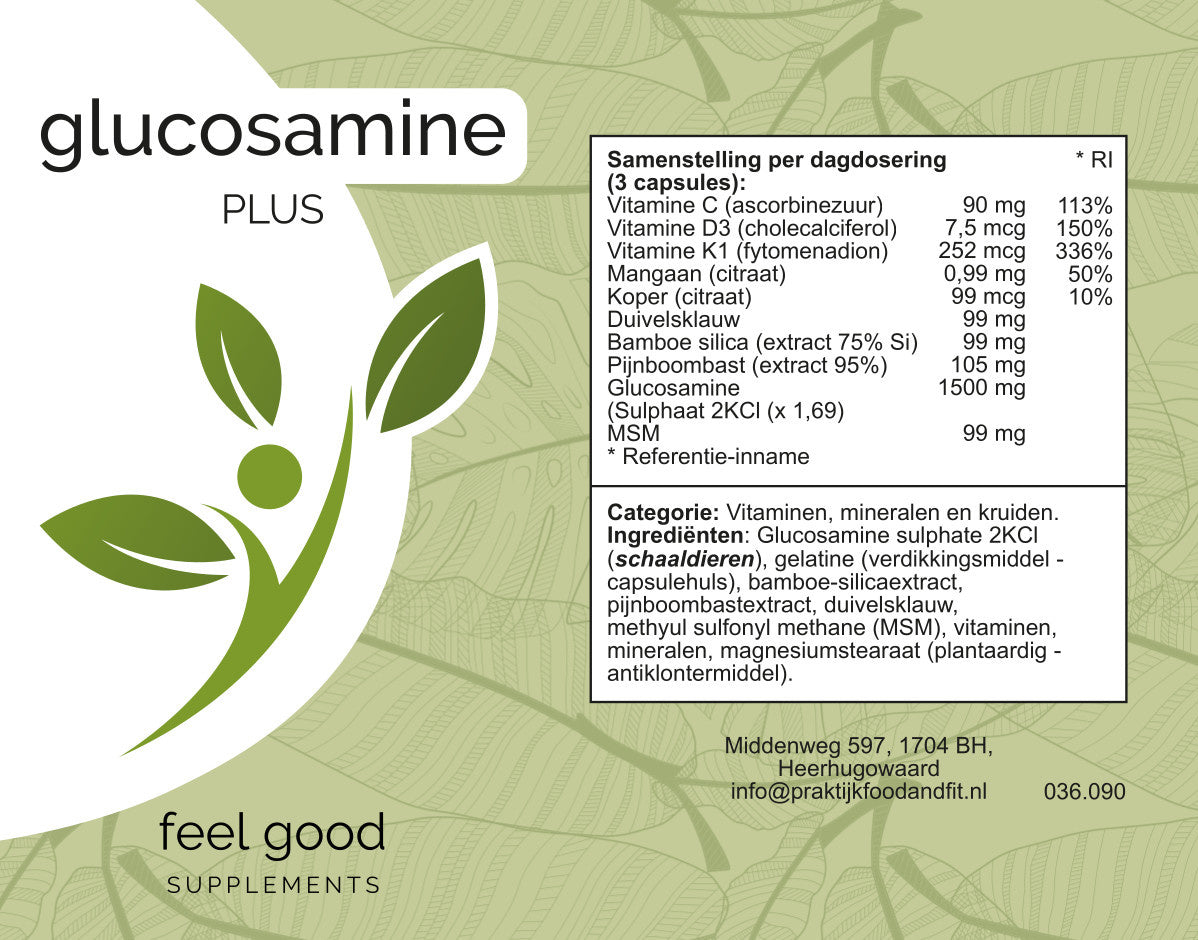 Glucosamine sulphate 2KCl (schaaldieren), gelatine (verdikkingsmiddel - capsulehuls), Bamboe silica extract, Pijnboombast extract, Duivelsklauw, methyl sulfonyl methane (MSM), vitaminen, mineralen, magnesium stearaat (plantaardig - antiklontermiddel).
