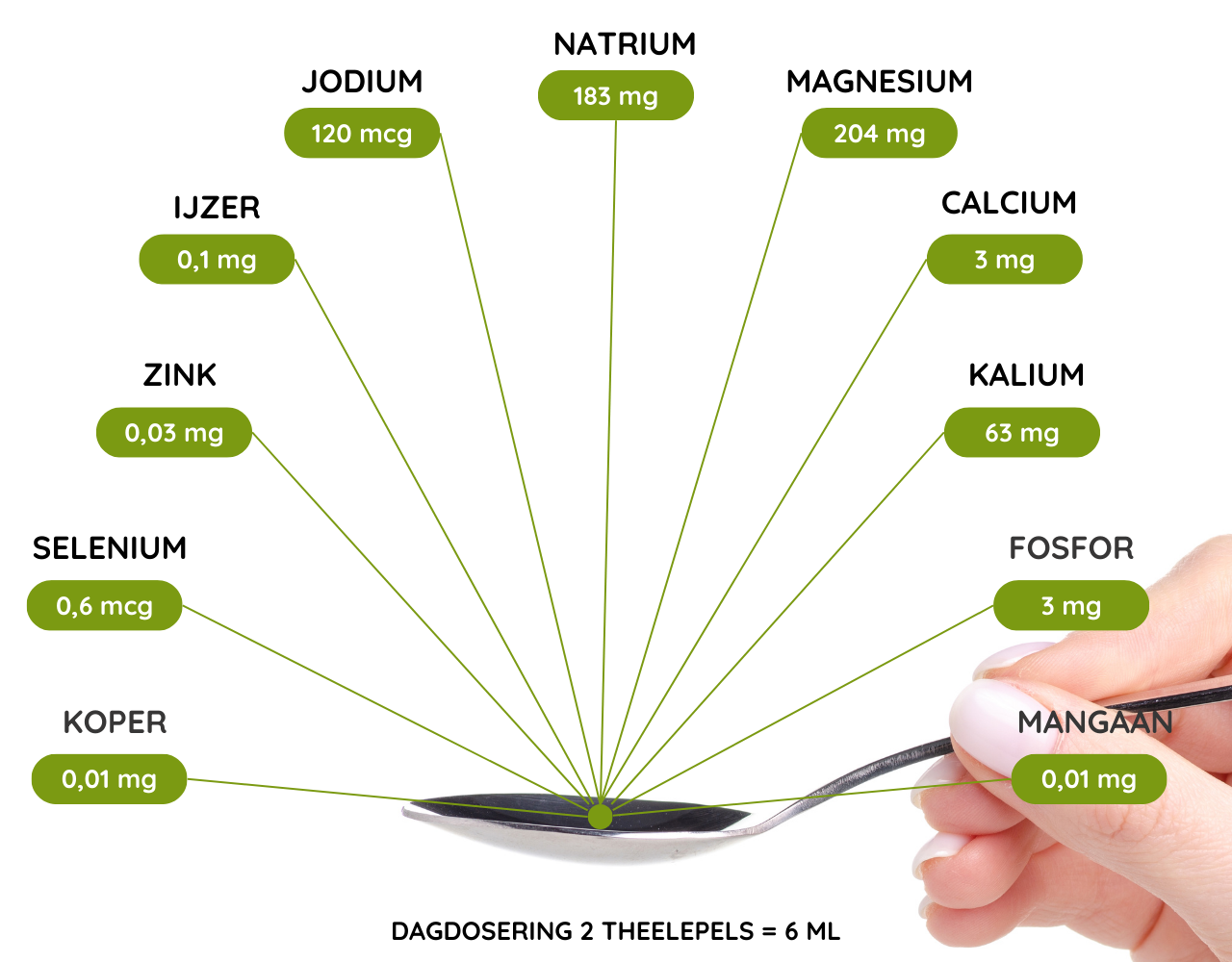 Geen capsules of grote tabletten: je neemt het als 2x per dag een theelepel in een glas water. Daarmee krijg je o.a. magnesium (204 mg) en jodium (120 mcg) binnen per dagdosering.