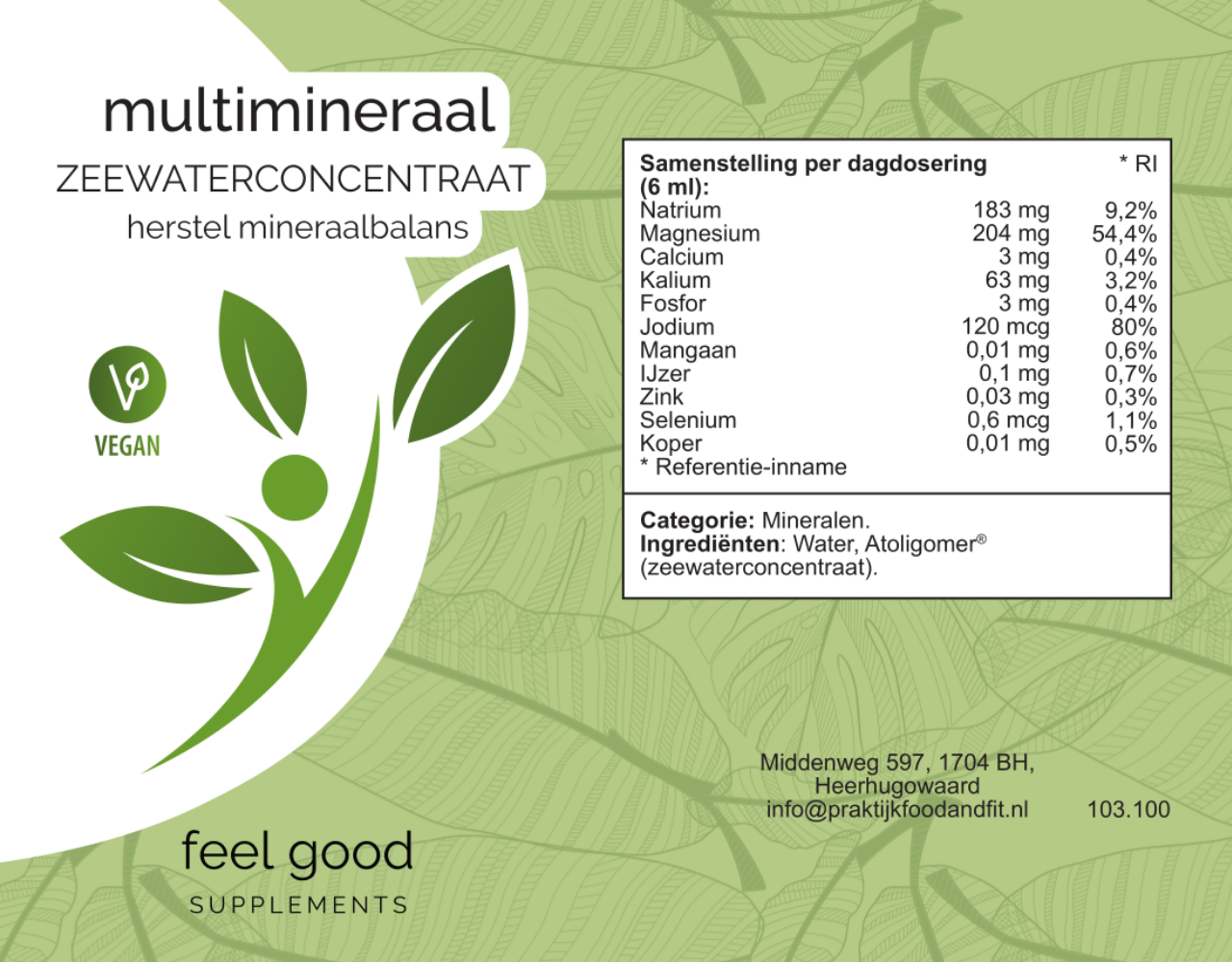 Multimineraal is een vloeibaar zeewaterconcentraat (Atoligomer®) met 11 essentiële mineralen, eenvoudig te mengen in water. Ideaal als je je mineraalinname praktisch wilt ondersteunen, bijvoorbeeld bij een actieve leefstijl, sporten of warme dagen.