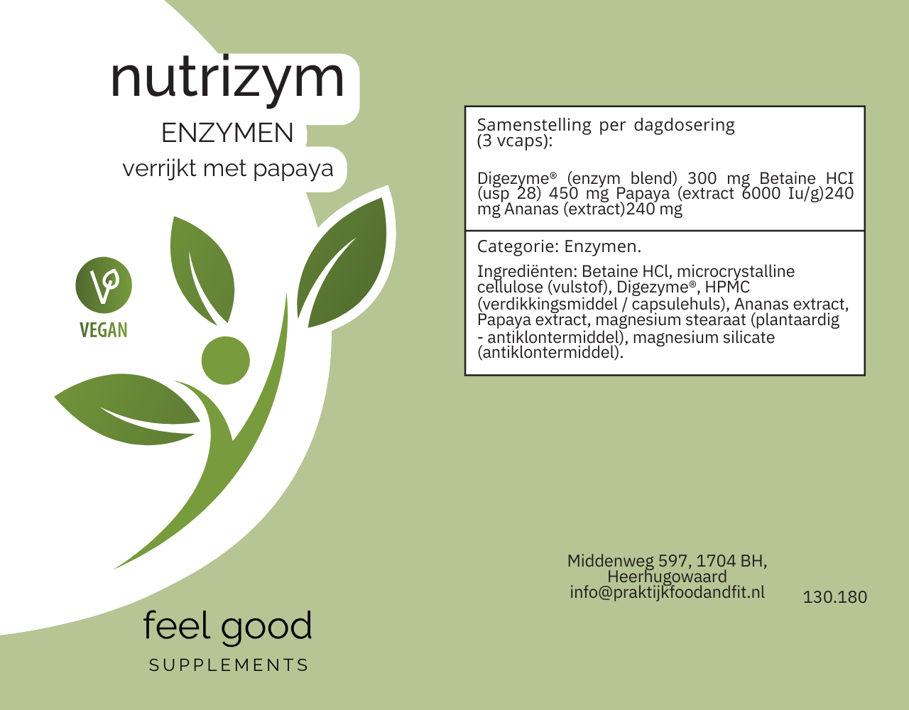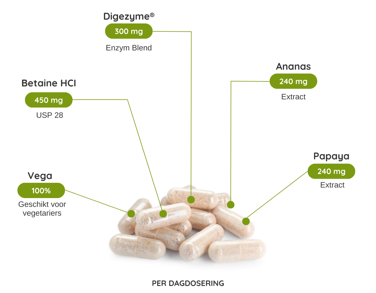 Betaine HCl, microcrystalline cellulose (vulstof), Digezyme®, HPMC (verdikkingsmiddel/capsulehuls), Ananas extract, Papaya extract, magnesium stearaat (plantaardig - antiklontermiddel), magnesium silicate (antiklontermiddel).